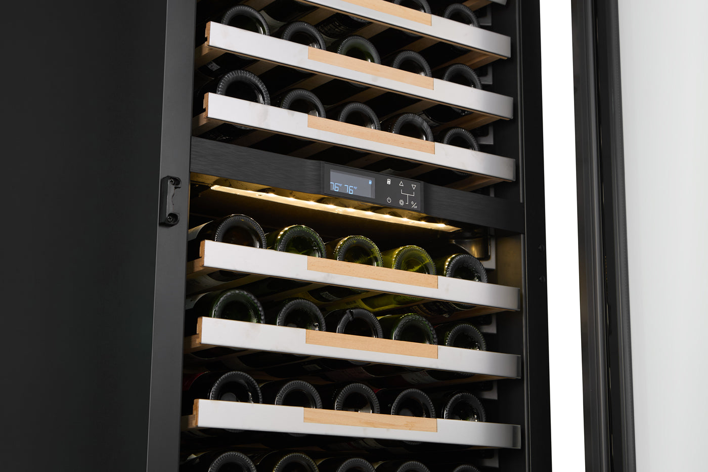 Une solution premium pour la conservation et la présentation du vin, avec une capacité de 133 bouteilles (750 ml) et deux zones de température indépendantes réglables de 5 à 20 °C (41-68 °F).